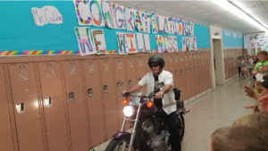 Le principal part à la retraite en traversant son école en Harley-Davidson